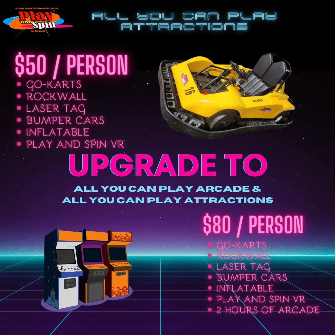 - All you can play (2 hours as part of the combo) of non-stop gaming with access to over 125 arcade games.